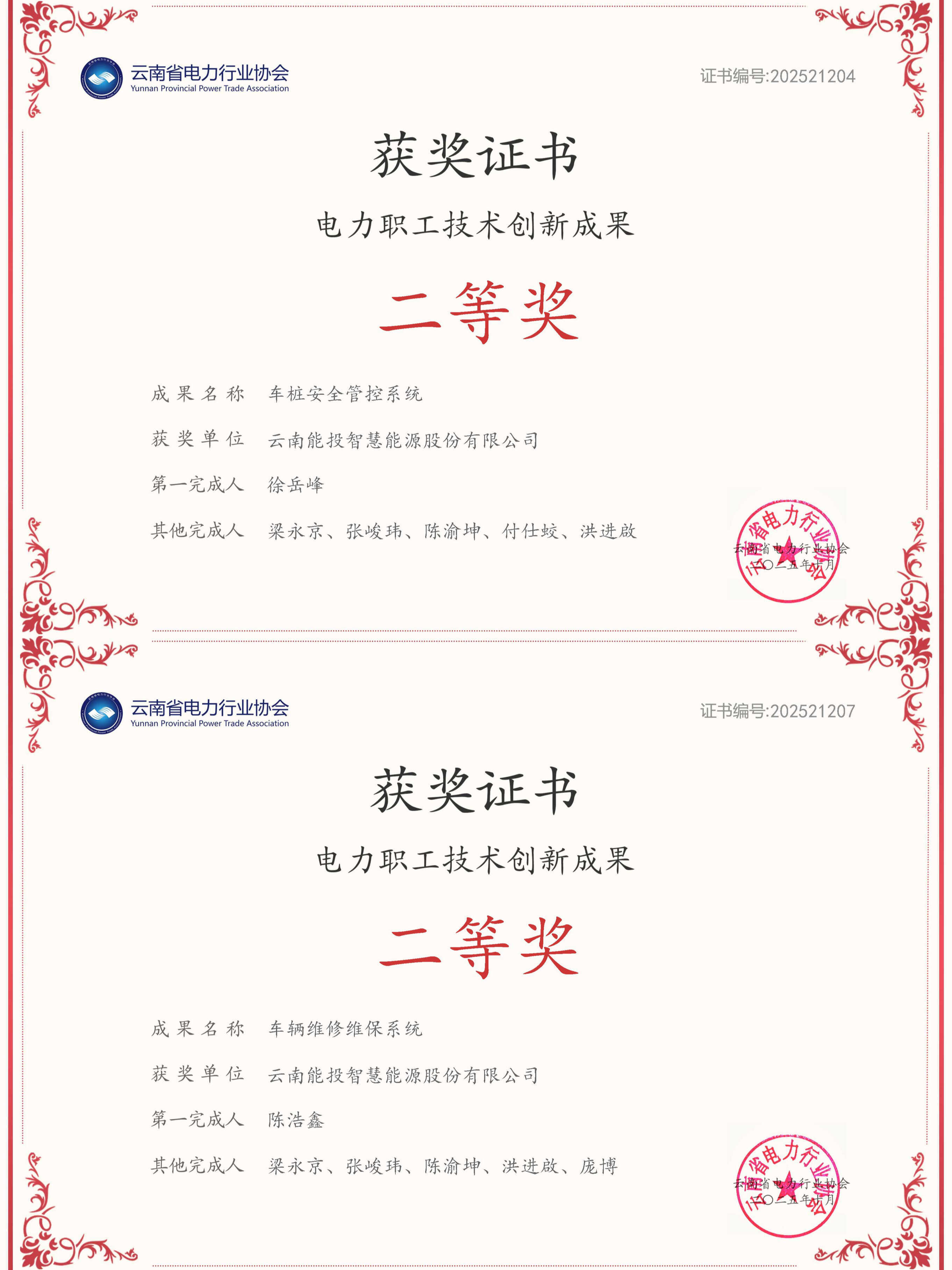 近日,云南能投智慧能源股份有限公司自主研发的 “车桩安全管理系统”与“车辆维修维保系统”两项自主研发成果,获得云南省电力协会职工技术创新成果奖二等奖殊荣。