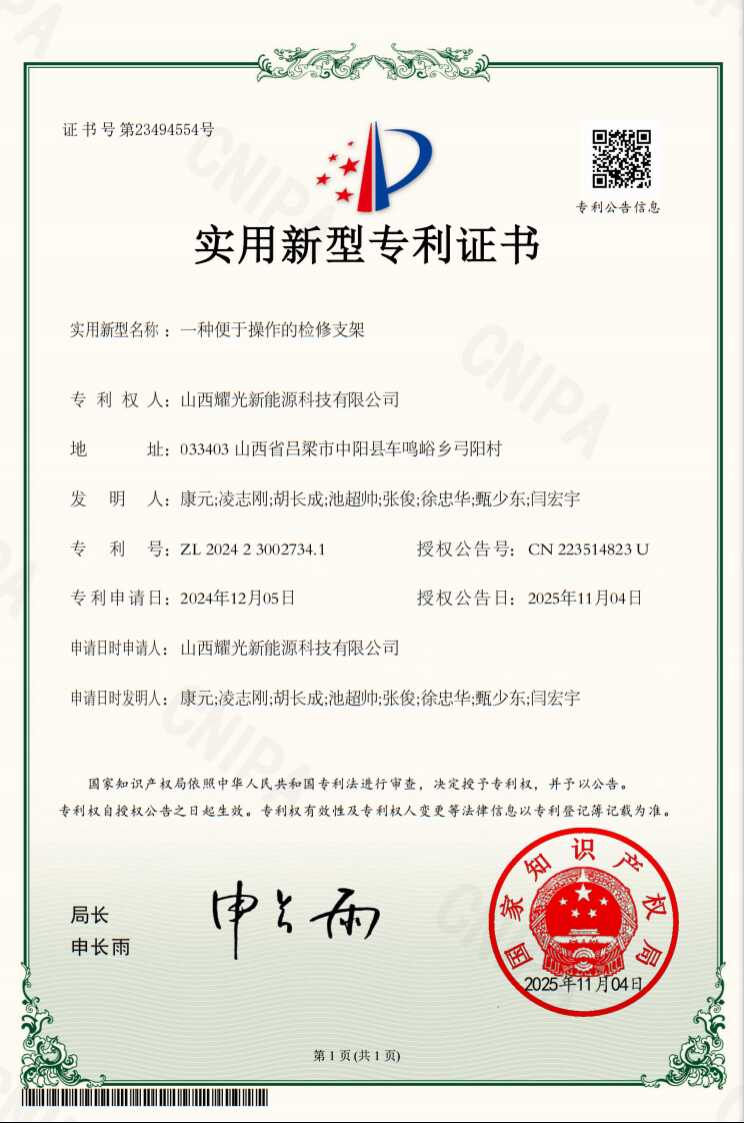 11月11日,榕耀山西公司耀光电站申报的《一种便于操作的检修支架》取得实用新型专利证书,至此耀光电站实用新型专利证书数量突破4项。