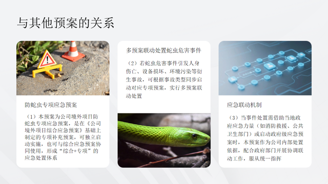 老挝、缅甸地处典型的热带气候区域,南非部分地区生态环境呈多元化特征,此三地均具备气候湿热、植被繁茂的共同特性。这些地区蛇虫种类繁杂,且部分蛇虫含有剧毒,对项目施工人员的日常作业与驻场生活构成了持续的潜在安全威胁。为保证《预案》具有科学性、针对性和可操作性,公司采取深度调研当地蛇虫种类图谱、复盘国内外同类安全案例、结合各项目现场地质环境等多项措施,全面梳理风险隐患点,明确应急组织机构及其职责分工,细化风险识别评估、日常预防、应急响应、急救处置以及后期保障等全流程关键内容。