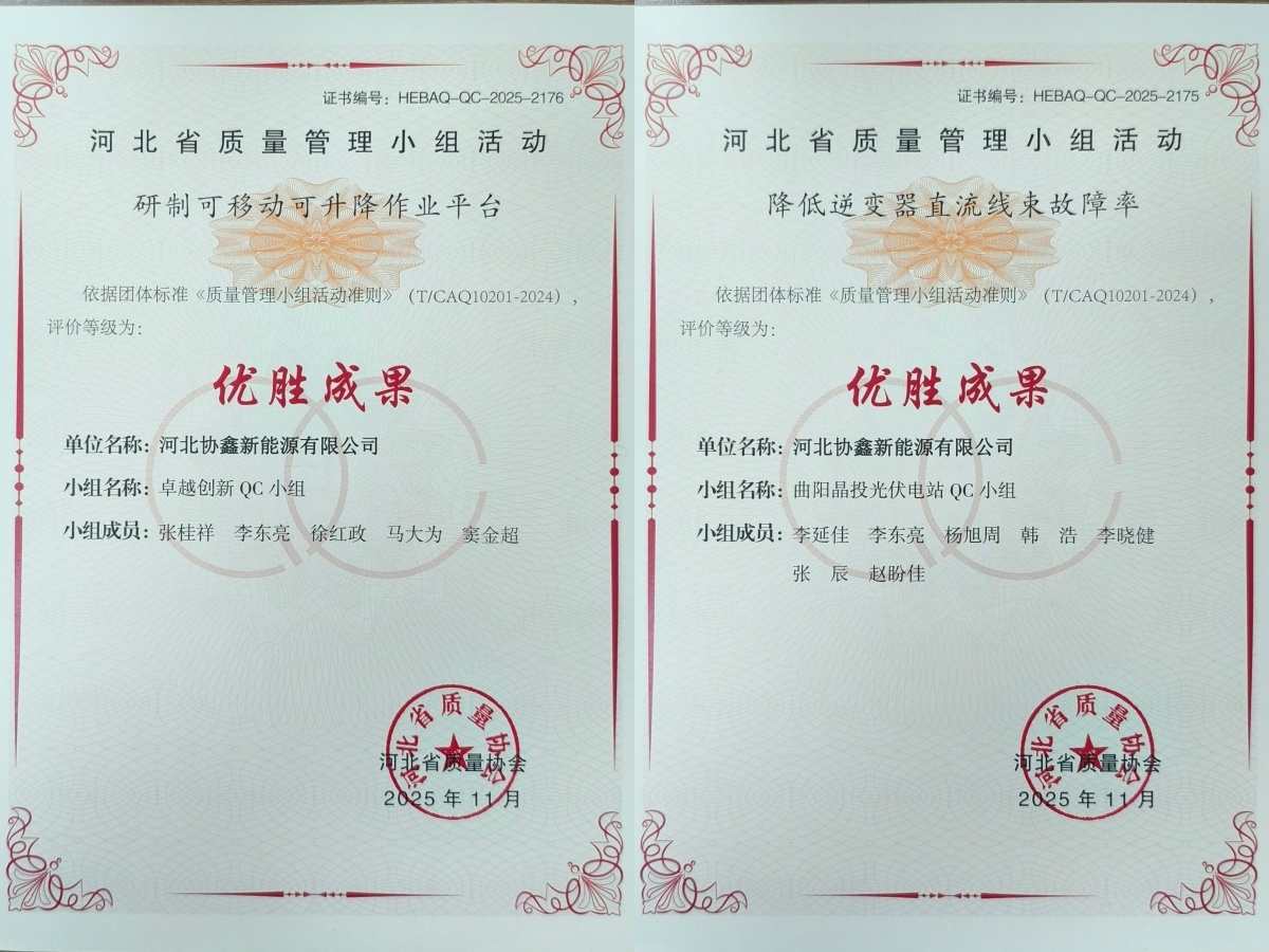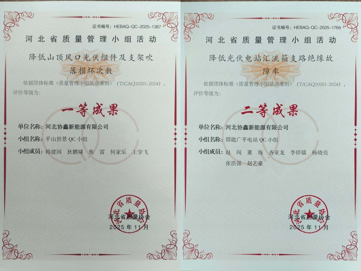其中《降低山顶风口光伏组件及支架吹落损坏次数》荣获全省一等成果、《降低光伏电站汇流箱支路绝缘故障率》荣获全省二等成果,另有4项成果荣获优胜奖。河北公司以QC小组活动为抓手持续推动精细化管理和精益生产,运用科学质量管理方法,聚焦光伏电站现场痛点难点问题,通过深度剖析问题根源、精准施策抓实整改,消除多项现场技术难题。