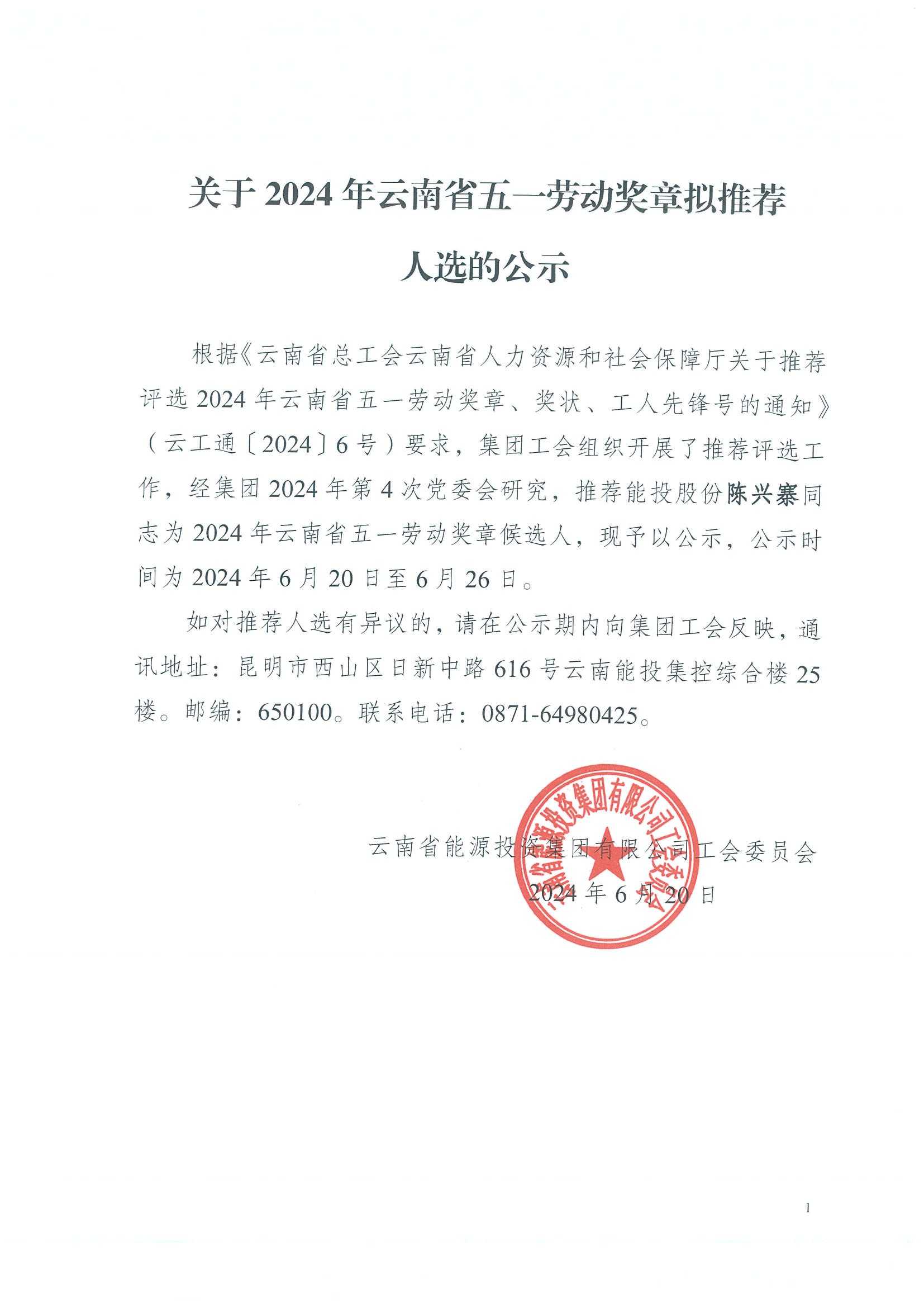 关于2024年云南省五一劳动奖章拟推荐人选的公示